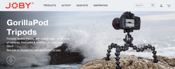 根據(jù)環(huán)境和使用場景來展示產(chǎn)品是電商網(wǎng)站常用的機(jī)巧。而實際的數(shù)據(jù)也表明,這樣的圖片擁有著極高的轉(zhuǎn)化率。舉個例子,下面所展示的 GorillaPod 就將產(chǎn)品置于實際的使用場景中,給予用戶真實的使用體驗。靈活的三腳架在整個圖片中作為焦點(diǎn)而存在整個首圖的設(shè)計富有創(chuàng)造性,信息和內(nèi)容的傳遞也頗為高效。