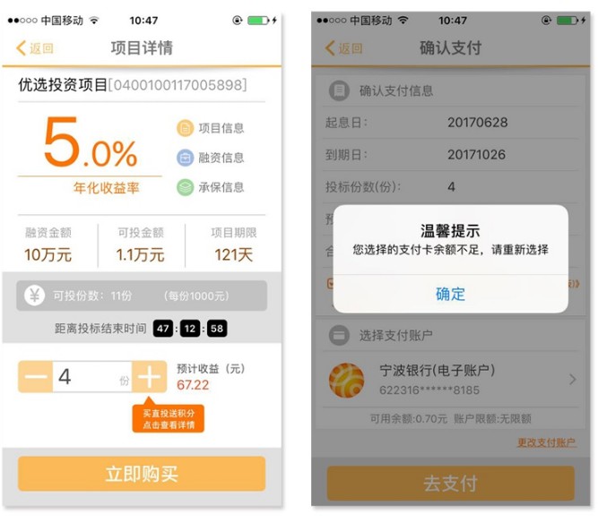 以寧波銀行直銷銀行為例,當(dāng)你想購(gòu)買 4000 元的直投項(xiàng)目的時(shí)候,點(diǎn)擊「立即購(gòu)買」按鈕,進(jìn)入「確認(rèn)支付頁(yè)面」,點(diǎn)擊「去支付」按鈕,這時(shí)候彈出一個(gè)對(duì)話框,告訴你賬戶余額不足。具體多少余額也沒有說清楚,你立馬去「我的賬戶」里看了余額再返回購(gòu)買,這時(shí)發(fā)現(xiàn)項(xiàng)目都被人搶光了,瞬間奔潰。
