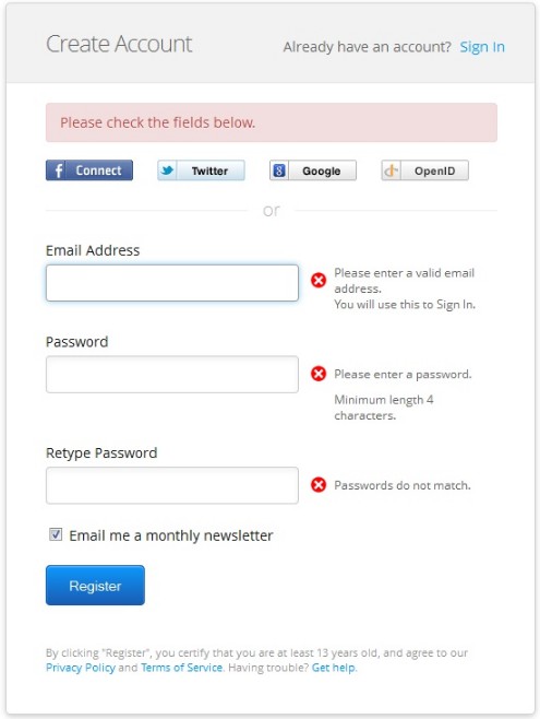現(xiàn)在還有很多設(shè)計(jì)師開始將錯(cuò)誤提示做成文字標(biāo)簽形式,將其和控件放在一起。這樣子用戶就可以很容易的讀取錯(cuò)誤信息,一眼就能看出來哪里出錯(cuò)了,不用根據(jù)提示的控件名稱去尋找出錯(cuò)的位置,因?yàn)殄e(cuò)誤提示就在發(fā)生錯(cuò)誤控件的旁邊。此外還很容易改正,因?yàn)橛脩舨挥迷偬D(zhuǎn)頁(yè)面或去記那些冗長(zhǎng)的錯(cuò)誤信息。