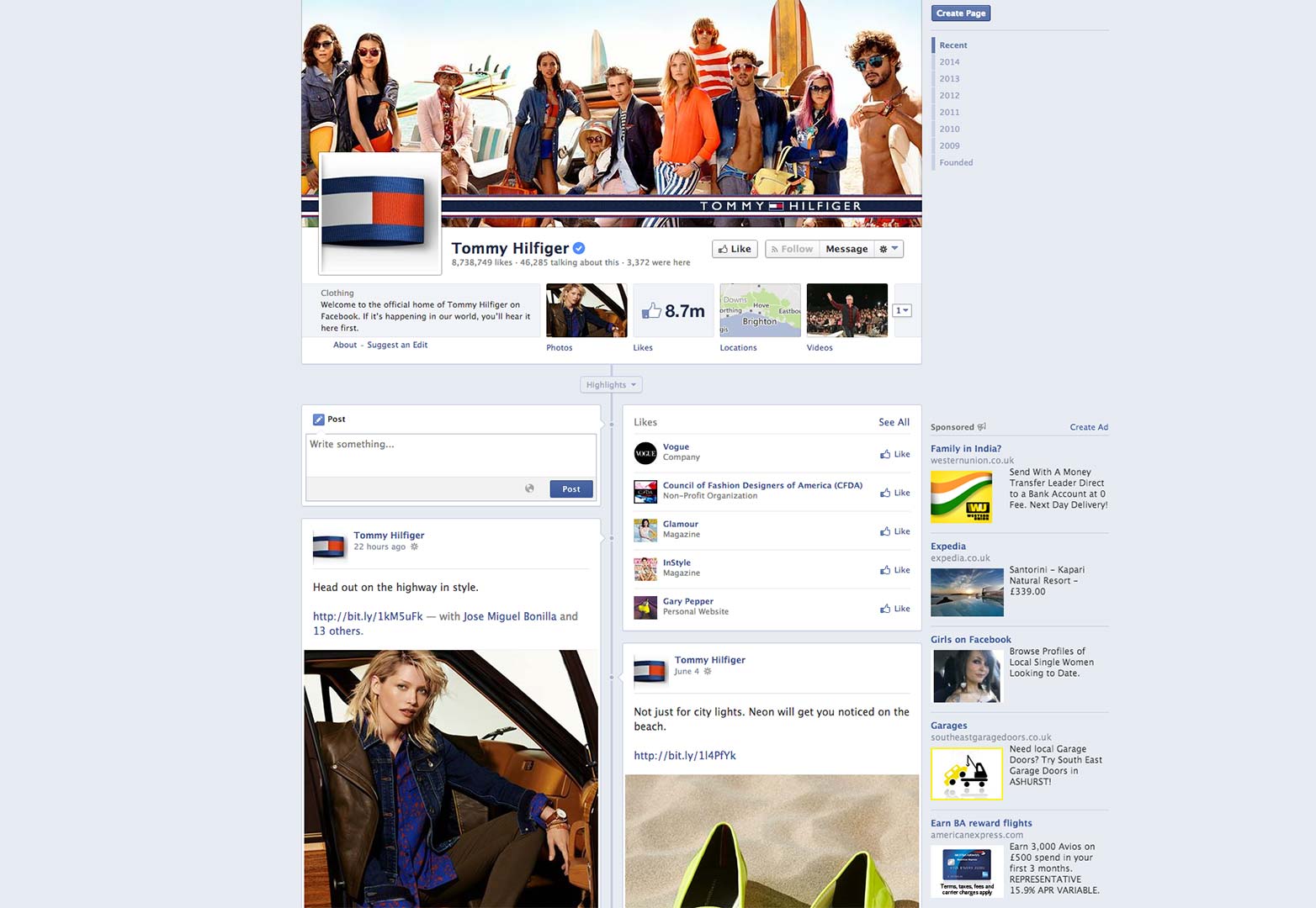 下面以Tommy-Hilfiger的Facebook頁(yè)面為例。這個(gè)美國(guó)潮牌的Facebook頁(yè)面有著870萬粉絲,如此眾多的粉絲都是Hilfiger品牌故事的忠實(shí) 聽眾。Hilfiger在頁(yè)面上分享設(shè)計(jì)、名人合作伙伴的照片和新聞以及各種宣傳活動(dòng),圖示通過圖片、視頻、文字等多種形式傳遞給用戶,引人入勝。