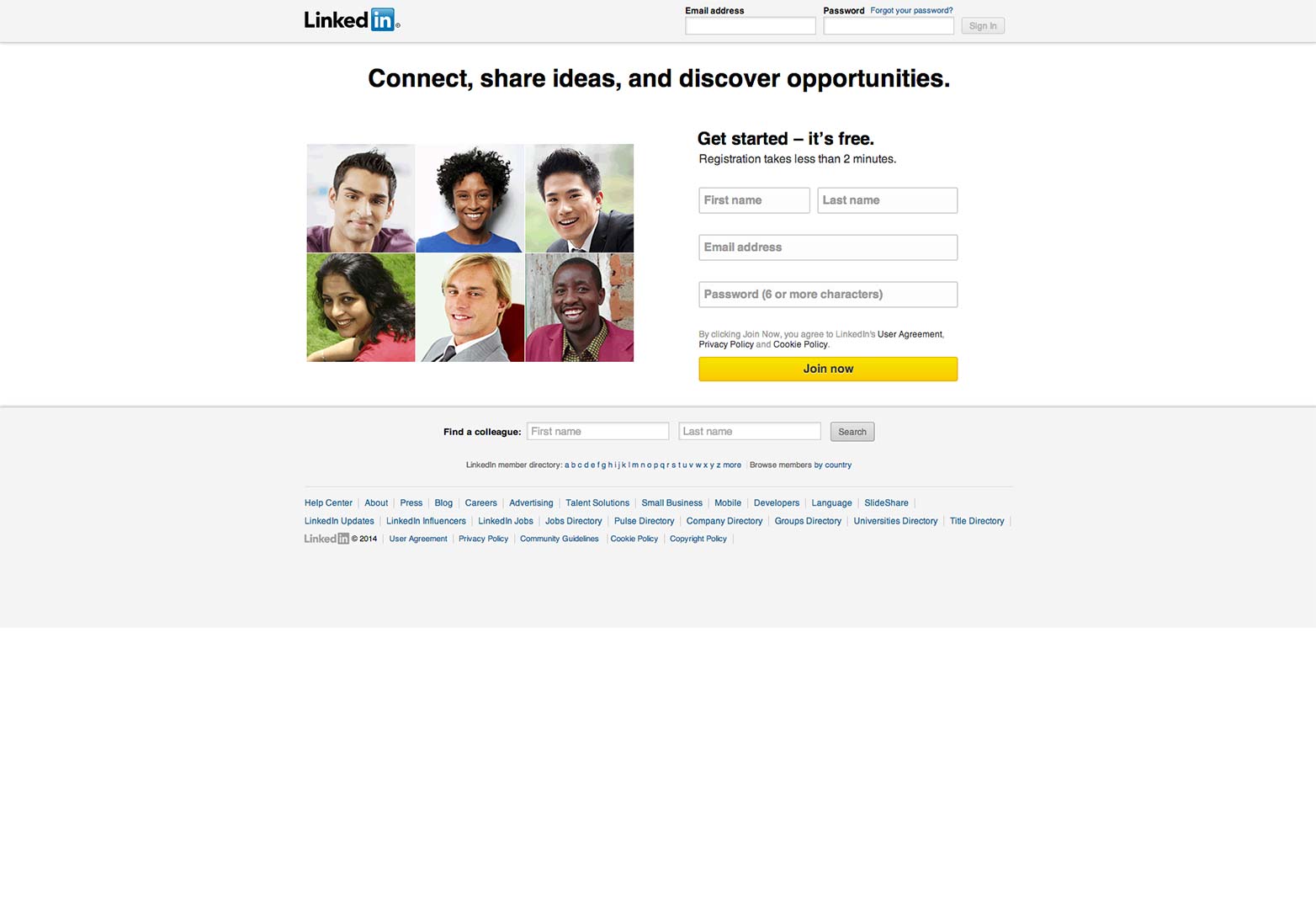 LinkedIn的注冊(cè)頁(yè)面就很好的說明了這一點(diǎn)。當(dāng)你打開注冊(cè)頁(yè)面的時(shí)候,左側(cè)的用戶小頭像是極具目的性的,它向用戶展示了網(wǎng)站用戶的多樣性,并且傳遞出一個(gè)信息:這個(gè)網(wǎng)站真正是適合每個(gè)人的。這些照片中的人,種族背景不盡相同,有男有女,不包括老年人,并且每個(gè)人看起來自信而快樂。哪怕是不明白 社交網(wǎng)絡(luò)的人也能夠通過這個(gè)簡(jiǎn)單的信息了解到這個(gè)星球上來自不同地域不同背景的人正匯聚于此,使用共同的服務(wù)一起交流 ,甚至業(yè)務(wù)往來。