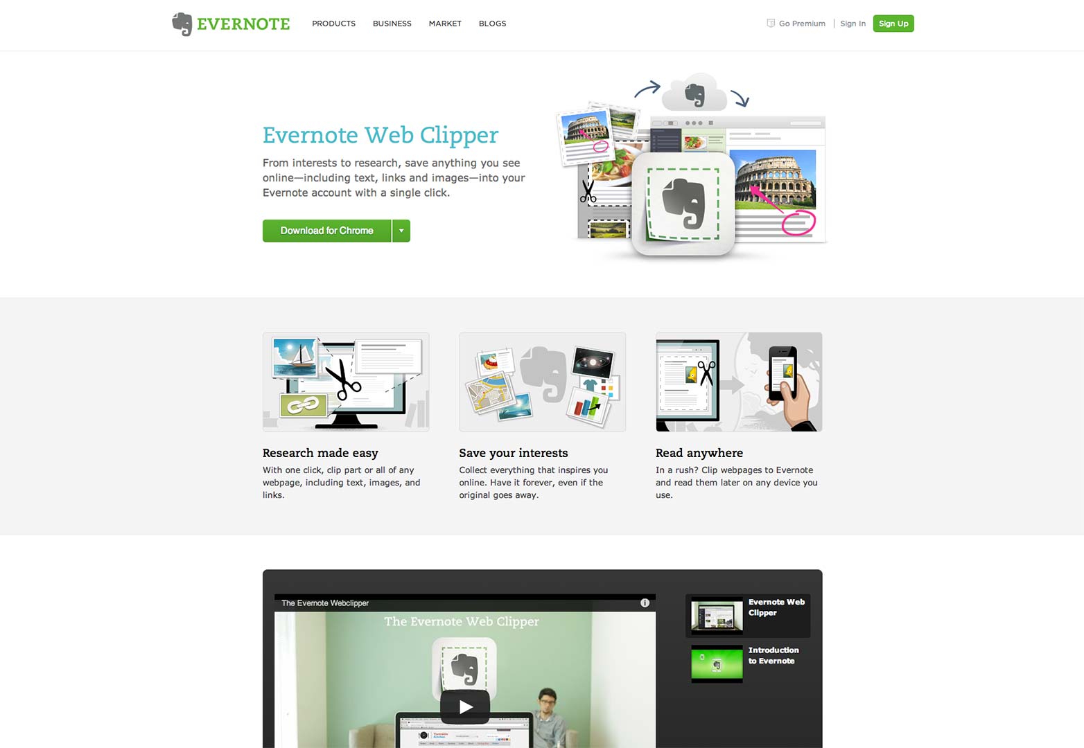 在Evernote Clipper的網(wǎng)頁(yè)中,我們看到了使用了偏向?qū)憣?shí)手法的故事闡述方式。插畫與文字結(jié)合在一起,告訴用戶Web Clipper是如何工作的,看起來像故事書一樣簡(jiǎn)單直白。