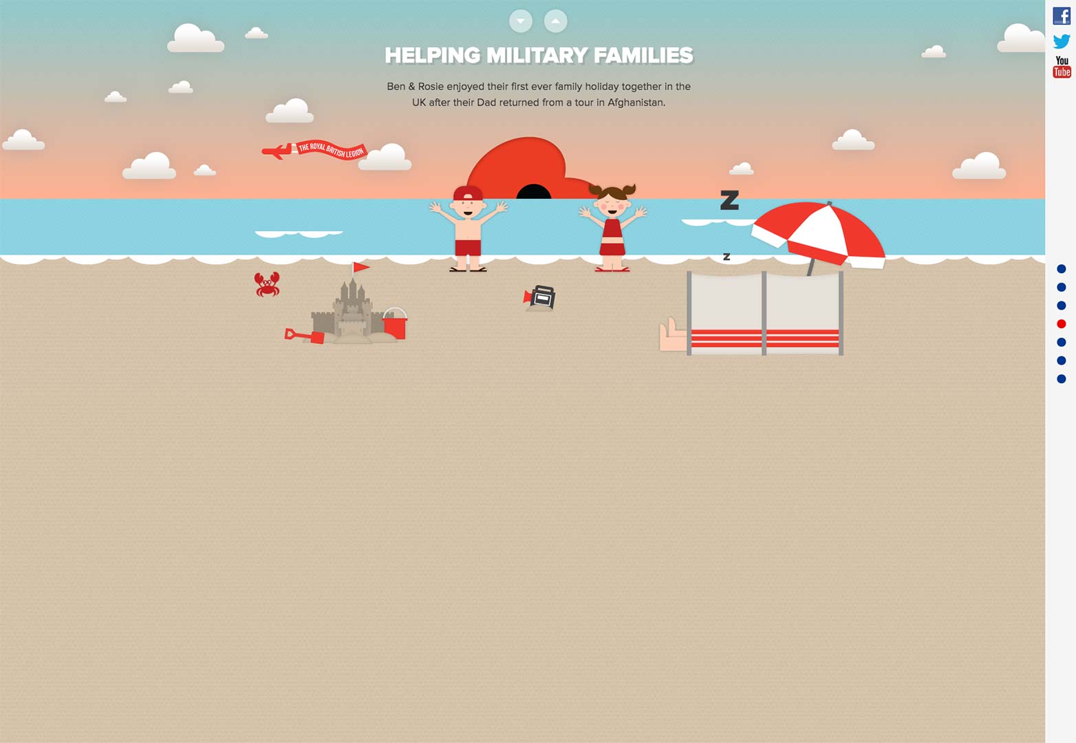 以The Royal British Legion為例,這個(gè)網(wǎng)站就是通過視差滾動(dòng)的方式想你展示了捐助是如何全程使用過來的必要信息。當(dāng)你向下滾動(dòng)的時(shí)候,這些充滿活力的故事就通過視差特效一一展現(xiàn)在你的眼前,你會(huì)看到軍團(tuán)為退伍老兵所提供的各種各樣有益的服務(wù)。