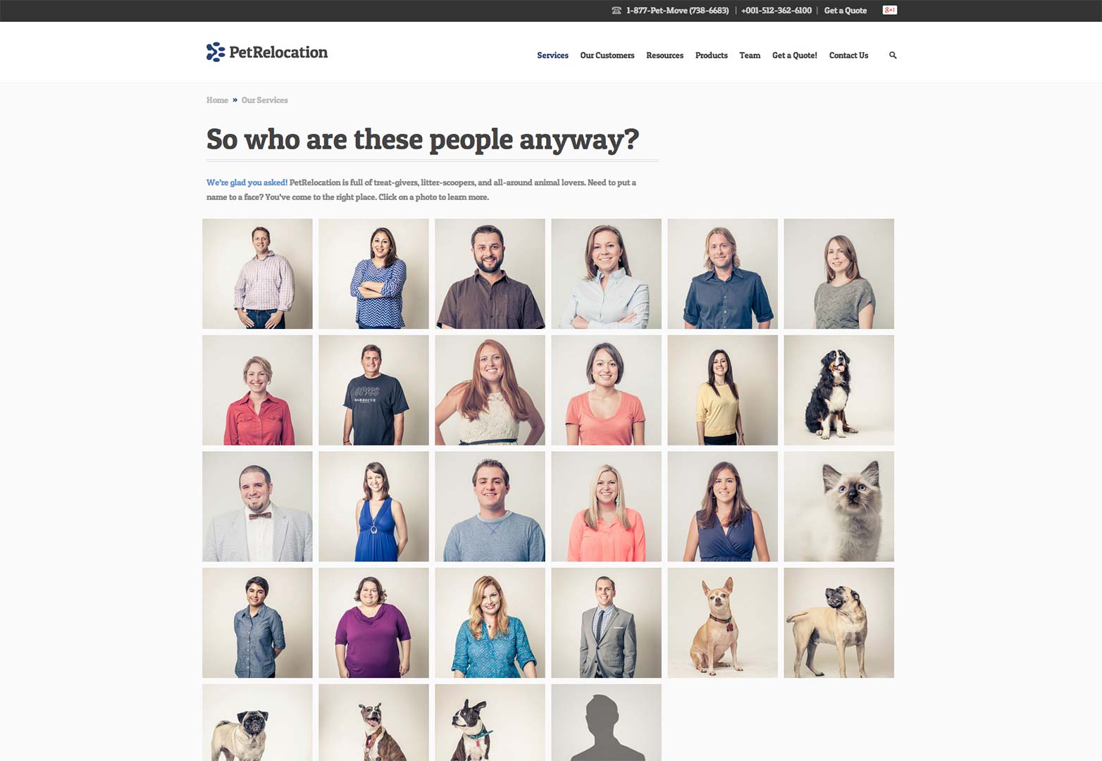 個(gè)性化讓你的品牌講述它偉大的故事。就以Pet Relocation為例子,在這個(gè)網(wǎng)站的團(tuán)隊(duì)介紹頁(yè)面中,每個(gè)成員都倍受矚目,這與傳統(tǒng)的“關(guān)于我們”頁(yè)面有著巨大的差別。你會(huì)在頁(yè)面中看到團(tuán)隊(duì)中每個(gè)人、每個(gè)寵物的微笑著的頭像,當(dāng)你鼠標(biāo)移動(dòng)到頭像上的時(shí)候,頭像會(huì)變成更加個(gè)性化的樣子——更萌、更有趣。而這種設(shè)計(jì)正是要告訴訪客,這家機(jī)構(gòu)的企業(yè)文化 是講究放松和自然的。
