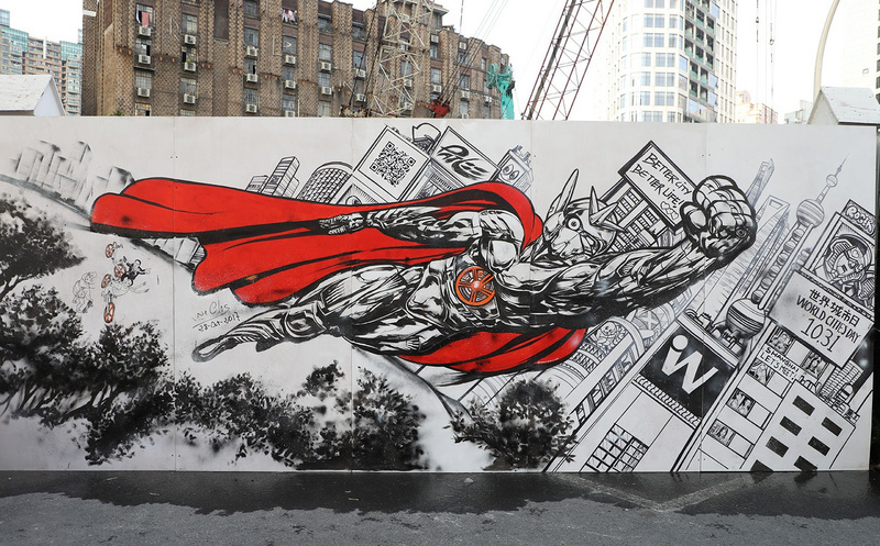 10月28日,位于南京西路石門一路口工地圍擋,國際知名漫畫藝術(shù)家Pat Lee以2017 “世界城市日”為背景,創(chuàng)作了摩拜單車主題藝術(shù)涂鴉作品。