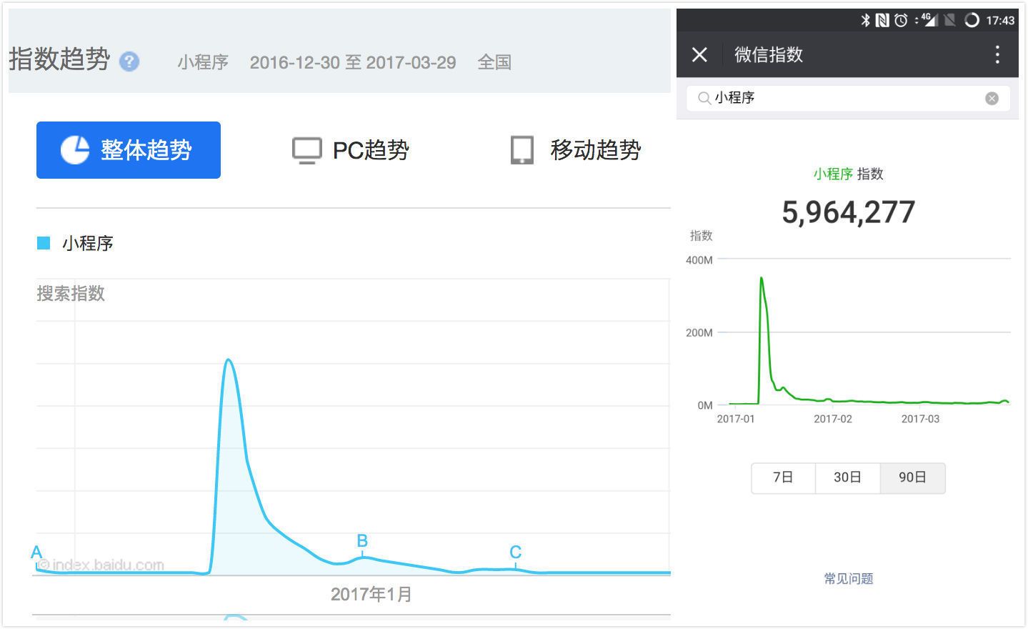 當然,這樣的收緊策略也在一開始就影響了小程序的步伐。無論是百度指數(shù)還是微信指數(shù),數(shù)據(jù)都很直接的告訴我們,小程序的表現(xiàn)并不理想。發(fā)布之后迅速攀升,之后的熱度同樣消退的很快,這對一個 MAU 9.63 億的產(chǎn)品來說是有些不盡如人意的。